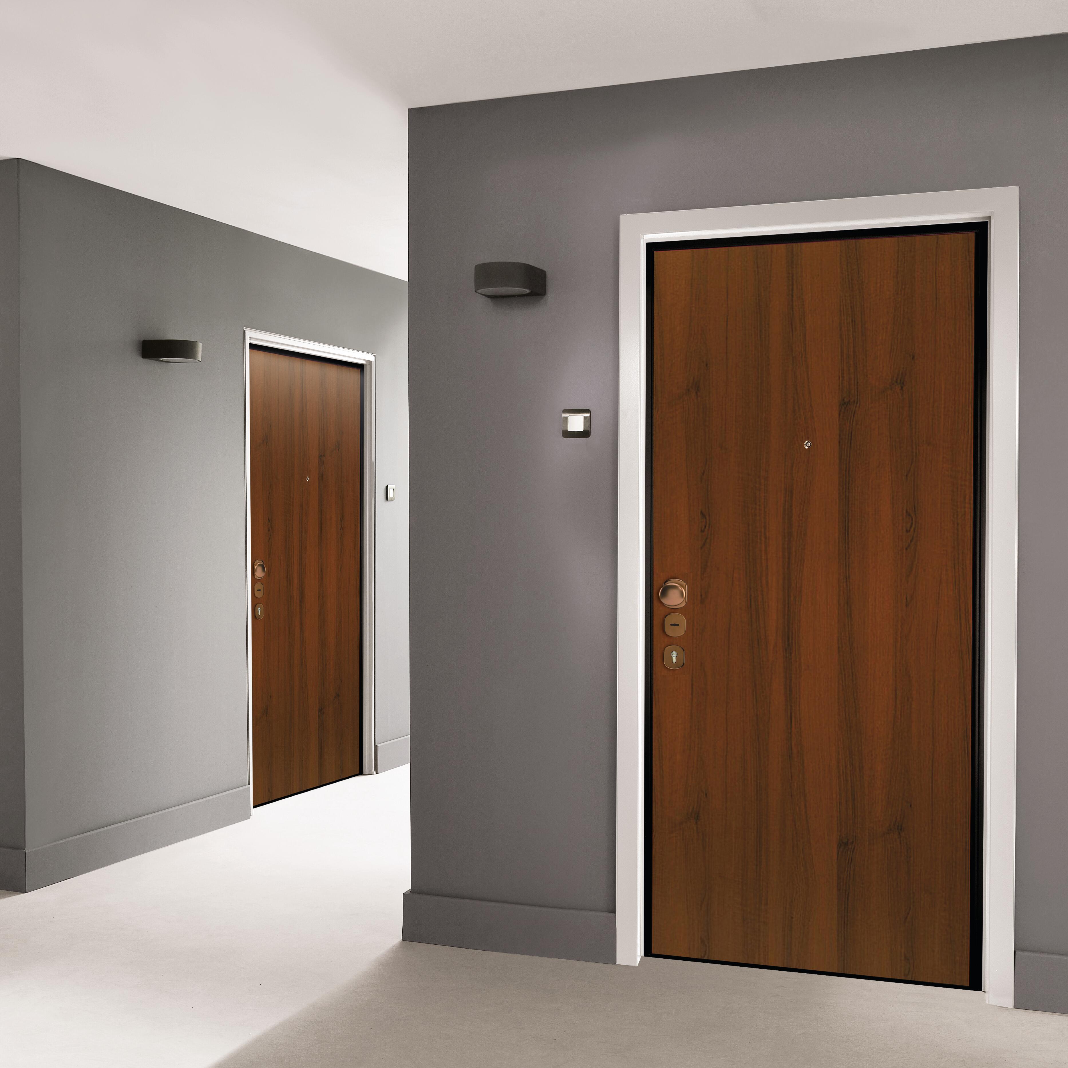 Pannello esterno laminato noce, classe di sicurezza 2, serratura yale doppia mappa, punti di chiusura 7. Consigliata per appartamenti posti all'interno di un condominio. Pannello indicato per ingressi situati in ambienti interni. La duplice serratura permette di avere una chiave di servizio da poter affidare a terze persone in totale sicurezza. Soglia antispifferi, aumenta l'isolamento termico ed evita l'ingresso di polvere ed insetti