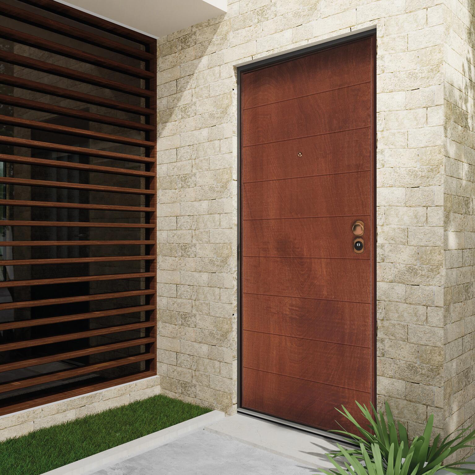 Pannello esterno compensato marino noce, classe di sicurezza 3, serratura yale cilindro europeo con defender, punti di chiusura 7. Consigliata per villette e case indipendenti. Pannello indicato per ingressi situati in ambienti esterni esposti alle intemperie. Ideale per garantire comfort termico e una riduzione dei consumi energetici. Limitatore di apertura, permette di aprire la porta parzialmente, tendendola comunque bloccata per maggiore sicurezza. Protezione antitrapano della serratura. Il cilindro della serratura è protetto con defender antitrapano per maggiore sicurezza