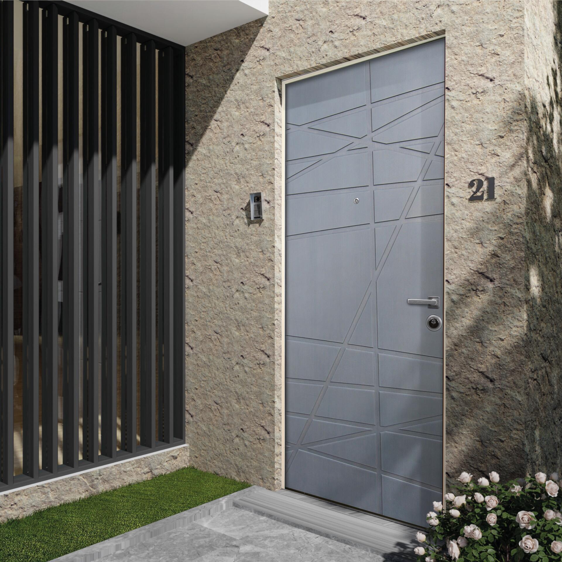Pannello esterno compensato marino grigio, classe di sicurezza 3, serratura cilindro europeo con defender, punti di chiusura 9. Consigliata per villette e case indipendenti. Pannello indicato per ingressi situati in ambienti esterni esposti alle intemperie. Protezione antitrapano grazie alla serratura con defender. Grazie alle cerniere a scomparsa la porta si può aprire di 120°