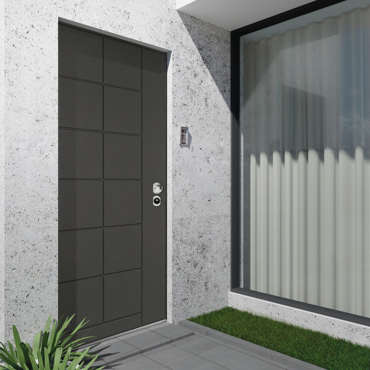 Pannello esterno mdf laccato platino, classe di sicurezza 3, serratura yale cilindro europeo con defender, punti di chiusura 6. Consigliata per villette e case indipendenti. Pannello indicato per ingressi situati in ambienti esterni in posizione riparata. Ideale per garantire comfort termico e una riduzione dei consumi energetici. Limitatore di apertura, permette di aprire la porta parzialmente, tendendola comunque bloccata per maggiore sicurezza. Protezione antitrapano della serratura. Il cilindro della serratura è protetto con defender antitrapano per maggiore sicurezza