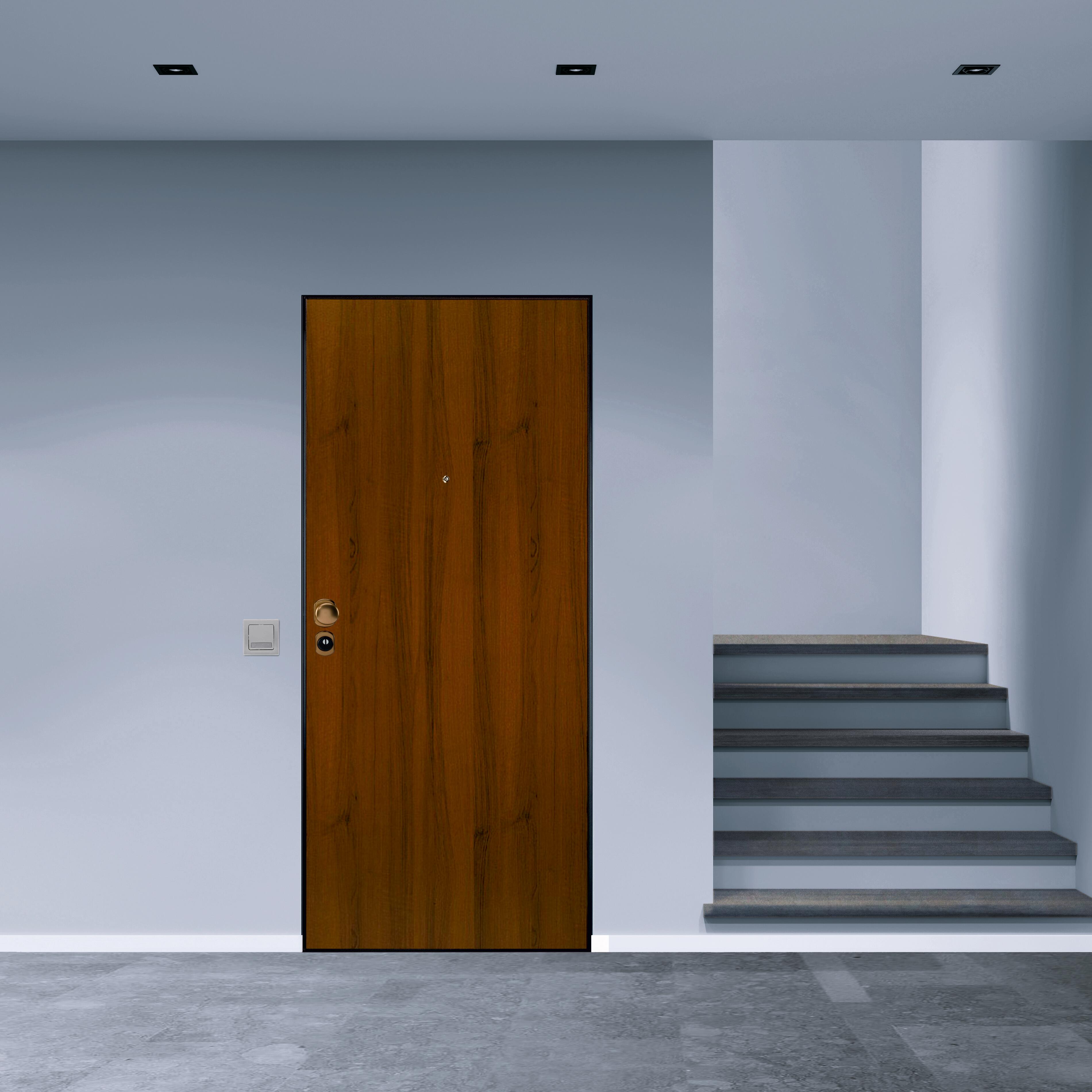 Pannello esterno laminato noce, classe di sicurezza 2, punti di chiusura 6. Consigliata per appartamenti posti all'interno di un condominio. Pannello indicato per ingressi situati in ambienti interni. Serratura motorizzata. Soglia antispifferi, aumenta l'isolamento termico ed evita l'ingresso di polvere ed insetti