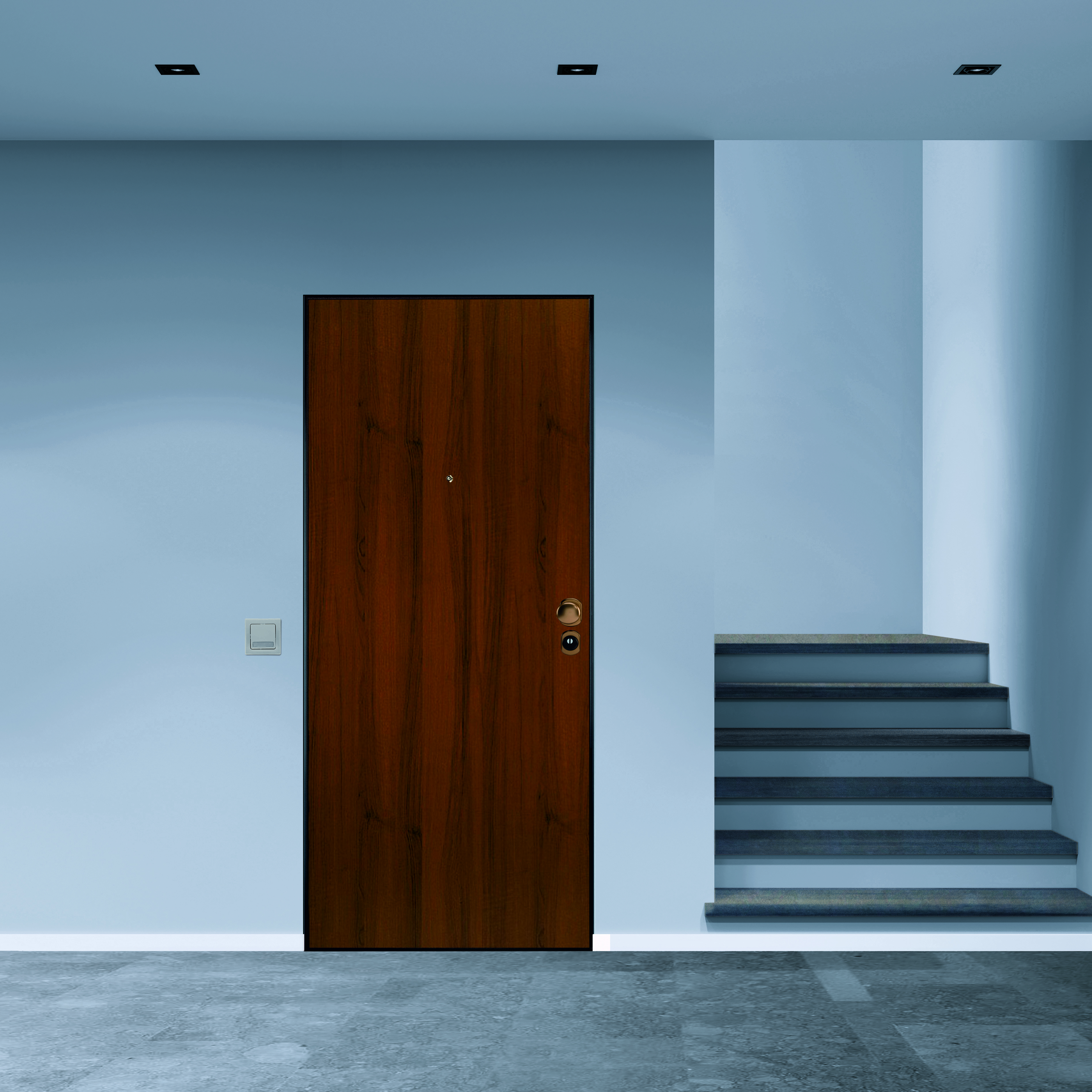 Pannello esterno laminato noce, classe di sicurezza 2, punti di chiusura 6. Consigliata per appartamenti posti all'interno di un condominio. Pannello indicato per ingressi situati in ambienti interni. Serratura motorizzata. Soglia antispifferi, aumenta l'isolamento termico ed evita l'ingresso di polvere ed insetti