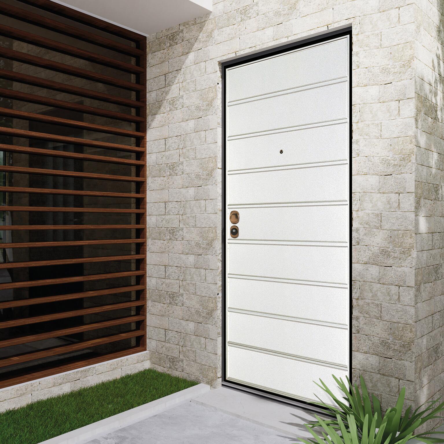 Pannello esterno pvc pellicolato bianco, classe di sicurezza 3, serratura yale cilindro europeo con defender, punti di chiusura 7. Consigliata per villette e case indipendenti. Pannello indicato per ingressi situati in ambienti esterni esposti alle intemperie. Protezione antitrapano della serratura. Il cilindro della serratura è protetto con defender antitrapano per maggiore sicurezza. Soglia antispifferi, aumenta l'isolamento termico ed evita l'ingresso di polvere ed insetti. Limitatore di apertura, permette di aprire la porta parzialmente, tendendola comunque bloccata per maggiore sicurezza