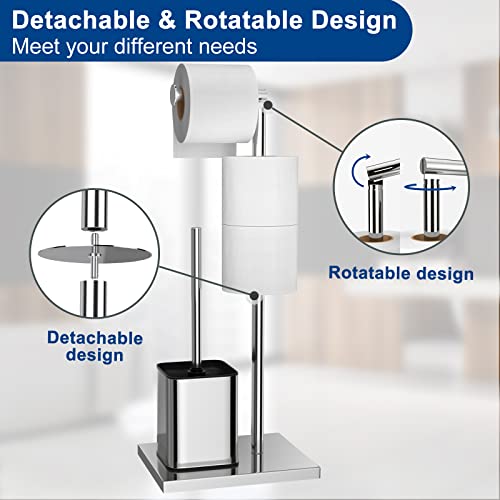 Porta Carta Igienica da Terra con Scopino - Acciaio Inox Piantana Portarotolo e Scopino per WC, Porta Rotoli Cartaigienica con Spazzolino WC, Senza Forare, in Piedi (Argento Lucido)
