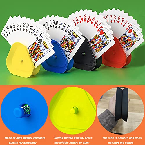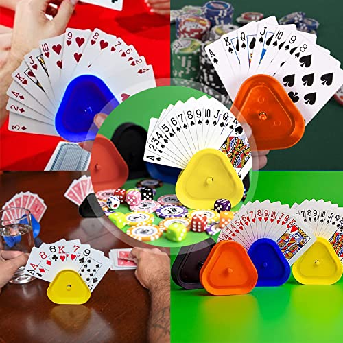 【Contenuto della confezione】riceverai reggi carte da gioco in diversi colori, un set di 4 pezzi, giallo, rosso, nero e blu. Il porta carte da gioco plastica è triangolare e tre i lati possono stare sul tavolo, quindi non devi tenerlo, facilmente e senza sforzo.