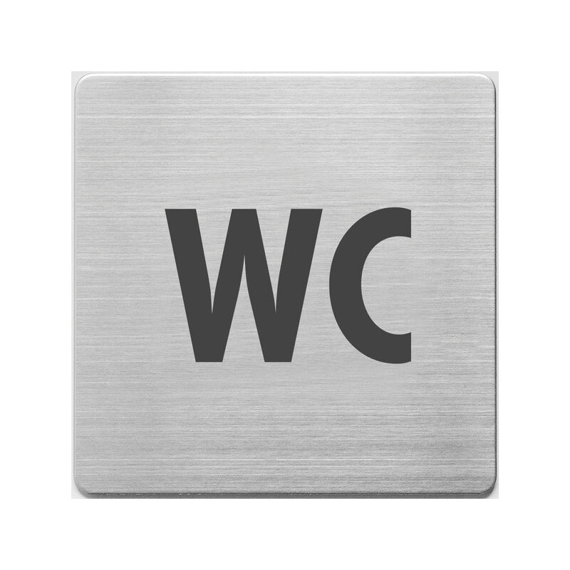 Pittogrammi autoadesivi in acciaio inossidabile spazzolato opaco di alta qualità con stampa nera, modello quadrato con angoli arrotondati, stampa: WC, dimensioni 90x90x1 mm.