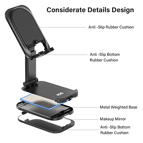 KDD Porta Cellulare da Tavolo Pieghevole, con Specchio Trucco 2 in 1 Supporto Telefono Regolabile Angolo e Altezza per Porta Cellulare Compatibile per iphone 14 Pro Max 13 mini 12 XR Smartphone 4-8''