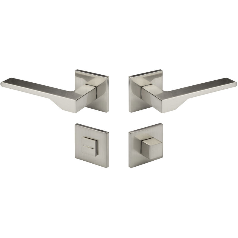 Set rosetta Q02.50, colore: nickel opaco, lunghezza maniglia: 107 mm, dimensioni rosetta (LxA): 52x52 mm, perno maniglia (Ø 8 mm): 105 mm per spessore porta 37-58 mm Maniglie di design per porte di bagni e stanze - Sostituisci le obsolete maniglie delle porte delle stanze e dei WC con le migliori maniglie moderne a rosetta. Premium, nella lavorazione e nel design - I nostri raccordi a rosetta in alluminio legato non convincono solo per il loro nobile aspetto materiale e la loro forma spigolosa. Nobile, senza tempo, rappresentativo: set di porte di design per porte di bagni e camere Il design fa la differenza! L'architettura moderna è minimalista, si limita all'essenziale. Nelle stanze moderne, l'assenza di rosette delle porte è un elemento di design. Riducete all'essenziale gli accessori delle vostre porte e sostituite le maniglie obsolete con quelle ultramoderne. Gli ambienti rappresentativi dell'abitazione e dell'ufficio beneficiano di soluzioni contemporanee di maniglie per porte