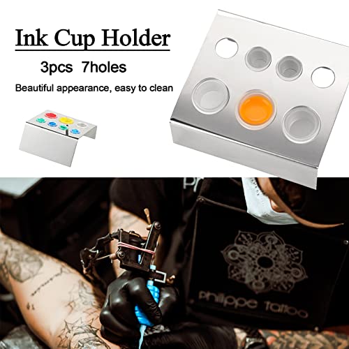 PACCHETTI COMPRESI - 3 pezzi di portabicchieri per inchiostro a pigmenti in acciaio inossidabile per 7 fori (tazze di inchiostro non incluse). Può contenere sette tazze di inchiostro: 4 tazze di inchiostro piccole, 2 tazze di inchiostro medie e 1 tazze di inchiostro grandi.
