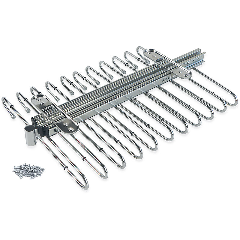 Il porta pantaloni estraibile Self permette di organizzare in modo efficiente lo spazio interno degli armadi e cabine armadio, facilantando l'accesso degli indumenti. E' prodotto in acciaio cromato, dispone di guide a sfere ad estrazione totale. Con 11 aste per appendere pantalocni cos� come una maniglia nella parte frontale per faciliatare l'estrazione del meccanismo. Prodotto in acciaio e plastica colore alluminio. Montaggio indistintamente lato destro o sinistro . Guide con sfere ad estrazione totale. Con maniglia per facilitare l'estrazione. Con 11 aste per appendere pantaloni. Include viti di montaggio. Include gomma antiscivolo. 1 porta pantalone estraibile, istruzioni per il montaggio, viti per il montaggio. - Cromato lucido Acciaio