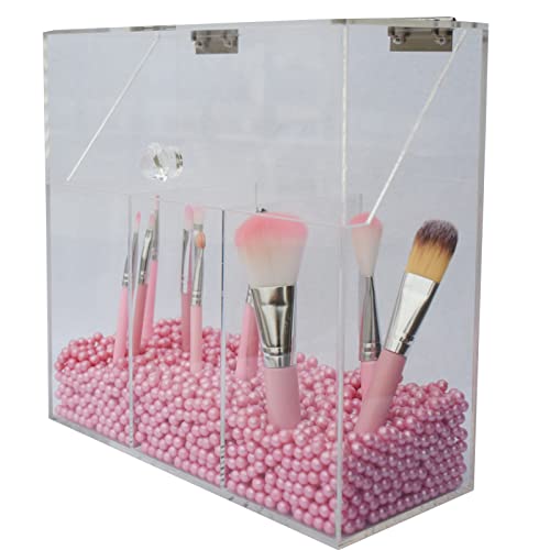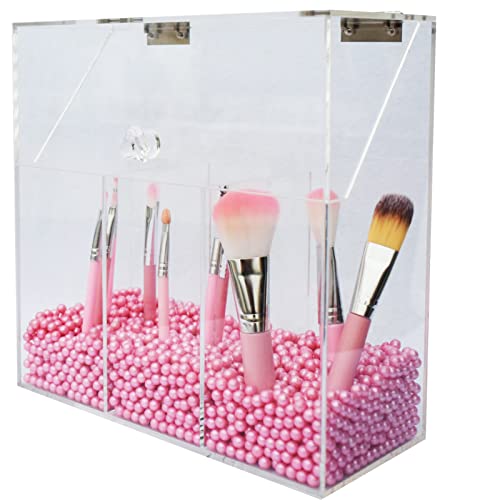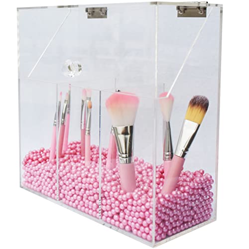 Porta pennelli da trucco in acrilico trasparente con coperchio antipolvere, 3 cassetti, perline di perle per cosmetici pennelli (rosa)