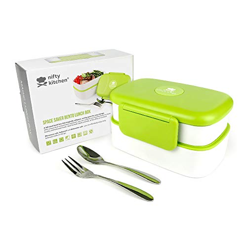 Porta pranzo Magic Space - Bento Box a 2 scomparti con coperchio a tenuta stagna per prevenire I versamenti - Adatto per forno a microonde, per adulti. Include posate, divisori ed eBook di ricette