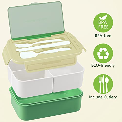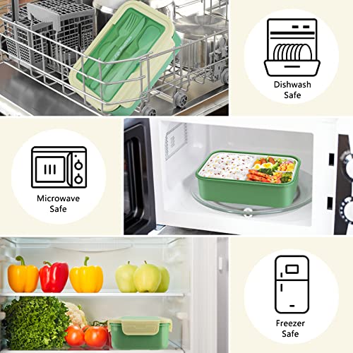 Porta Pranzo da Ufficio, Lunch Box Ermetico,Lunch Box Bambini Bento Box con 3 Scomparti e Posate(Forchetta e Cucchiaio)| Sicuri per Microonde e Lavastoviglie(Verde)