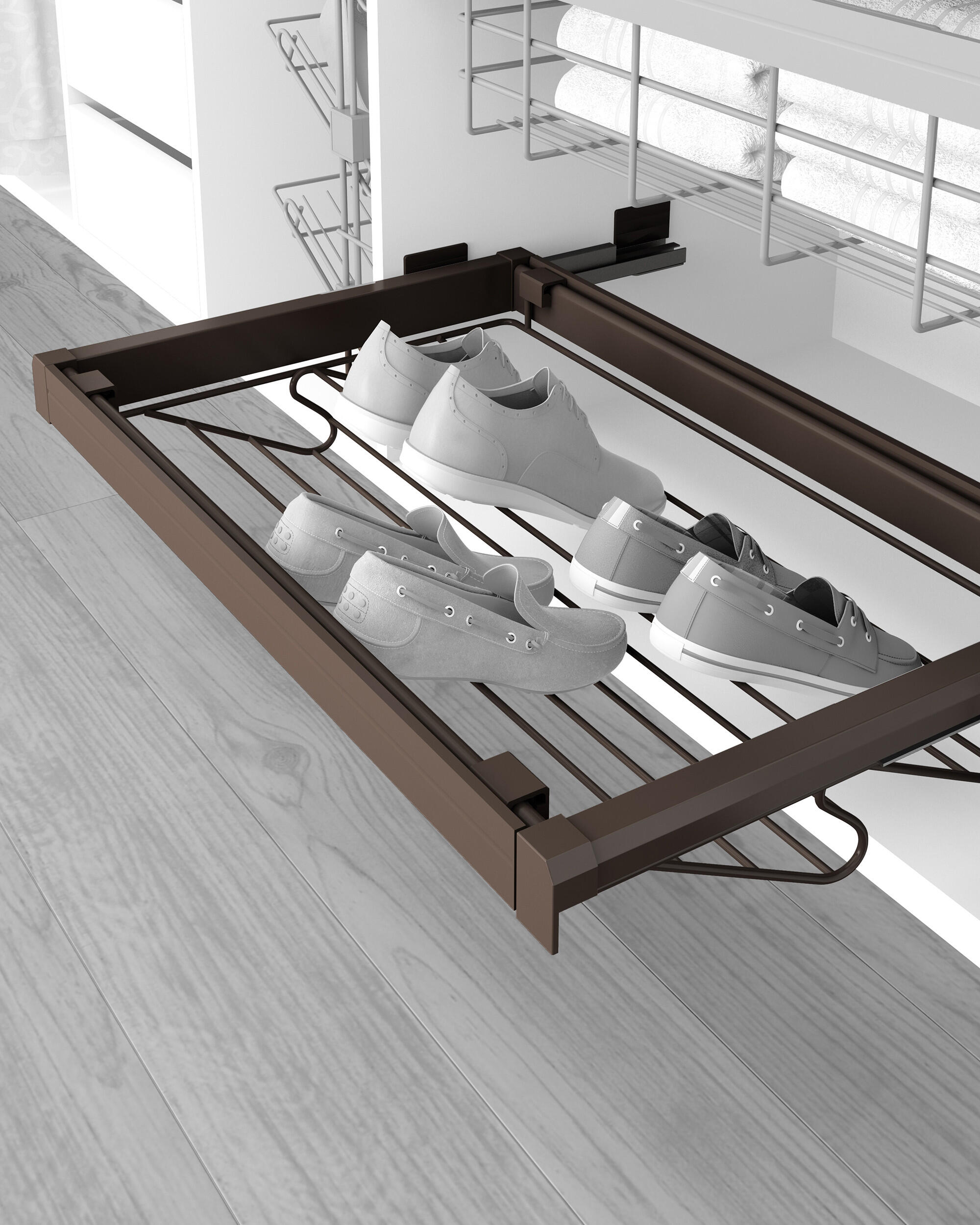Emuca Kit Porta scarpe metallico con guide, regolabile, modulo di 900 mm, Acciaio e Alluminio, Color moka. Organizzatori interni per armadio e cabine armadio. Kit composto da un casssetto porta scarpe e telaio con guide a scomparsa con estrazione totale e chiusura soft, inoltre ha un sistema di clip automato e rapido per l'installazione del telaio. E' regolabile per essere adattato a vano interno dell'armadio e sono prodotti in alluminio verniciato moka. Invece, il cassetto porta scarpe sono di acciaio con finitura verniciata moka.. Ideale per un vano interno armadio di 864-914 mm. Profondità minima del mobile 480 mm. Kit composto da un cassetto porta scarpe largo 775mm e da un telaio con guide di larghezza regolabile. Guide a scomparsa con estrazione totale e chiusura soft, con sistema a clip automatico e rapido per l'installazione del telaio. Finitura color moka