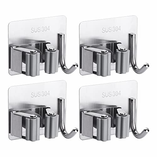 LY4U Porta Scopa SUS304 Supporti Autoadesivi da Parete in Acciaio Inossidabile con Gancio Porta Mop Senza Perfora per Bagno Cucina Ufficio Armadio Giardino Garage 4 Pezzi Rullo Grigio