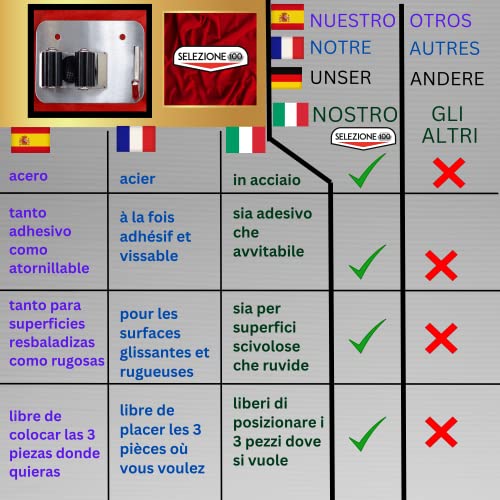 UTILE, STABILE + ACCESSORI. Appendiscope da muro con l'attacco "MOPCLIC" che sorreggere tutti i manico saldamente (scope, bastoni, attrezzi, martelli, tubi). largezza minima compresa tra 2 e 2.5cm (manici circolari / ovali /ellittici /perfino squadrati). Il costo del porta scopa da muro, è più alto perchè abbiamo usato solo acciaio sus 304, e per il costo aggiuntivo di bucare ogni pezzi, includendo tutti gli accessori. L'appendi scopa da muro include tutto: viti, tasselli, gli unici copri viti.