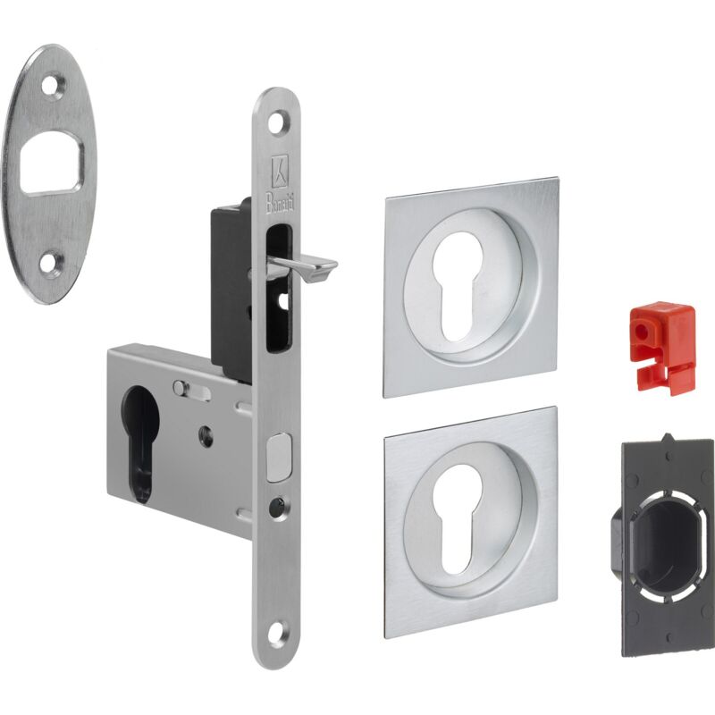 In acciaio. Per porte con spessore da 34 a 50mm. Non necessita di ditale di trascinamento. Composto da:- coppia di nicchie quadre ø 48mm con foro chiave- chiave- serratura G500T entrata 50 mm, frontale 160x16.Finitura bianco opaco