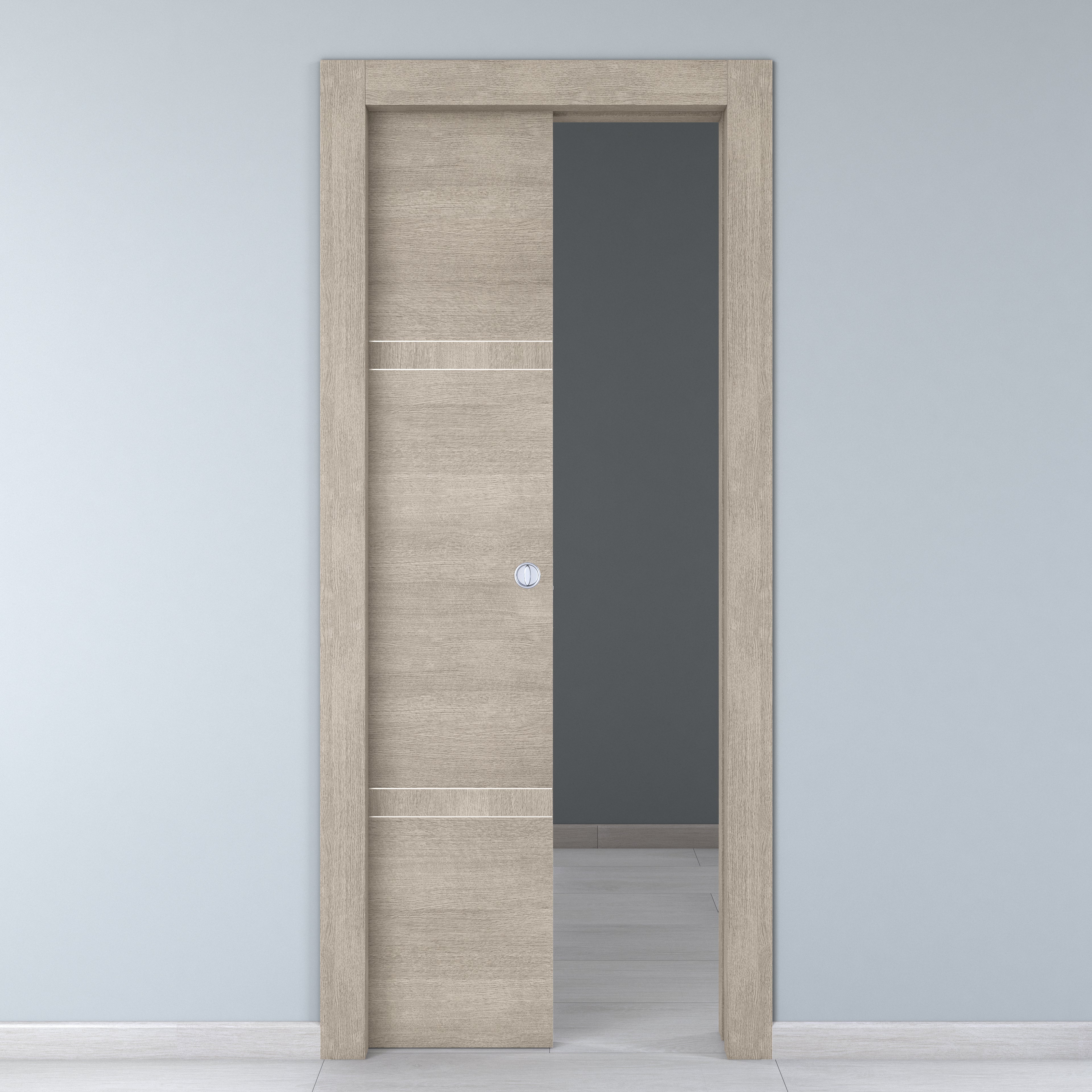 Laminata. Maniglia inclusa. Qualità Premium, porta raffinata che si distingue per la ricchezza del design. Ideale per personalizzare ambienti eleganti e di prestigio. Apertura scorrevole interno muro, ideale per stanze con spazi ridotti. Finitura resistente e funzionale. Il laminato resiste ai graffi ed è molto facile da pulire. Effetto spazzolato che riproduce le venature del legno donando un effetto materico molto naturale. Lascia libere le pareti senza ingombro di apertura.