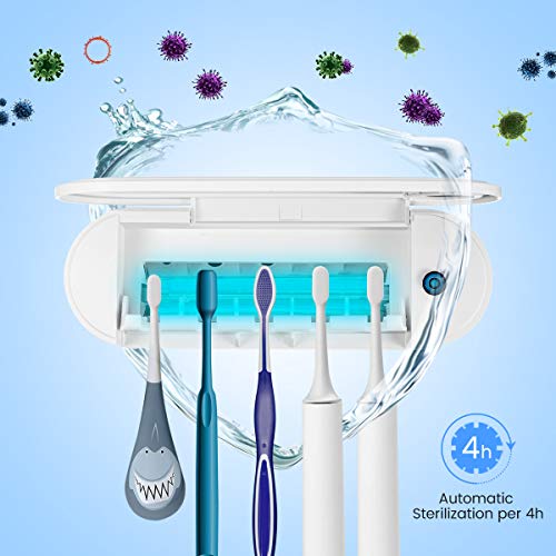 Portaspazzolino 3 in 1-Sterilizzatore UV, asciugatura e organizzativa, può contenere fino a 5 spazzolini da denti (comprese le teste di spazzolino elettrico), può pulire lo spazzolino, ogni testina dello spazzolino da denti è separata dalla piastra Interval, più sicura e salutare, mantiene il lavabo pulito e organizzato.