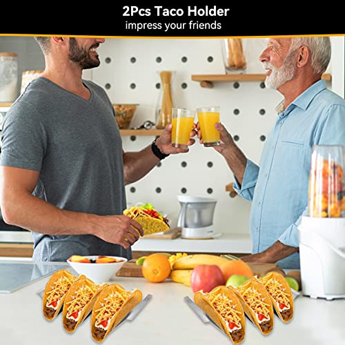 MATERIALE ALIMENTARE: Supporto per taco realizzato con acciaio inossidabile di alta qualità, sicuro, supporti per taco in acciaio inox resistente e durevole. Ogni acciaio inossidabile può trasportare 3 tacos.1 set include 2 pezzi