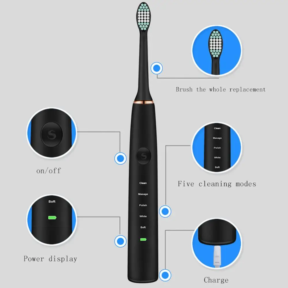 Portable IPX7 Waterproof Rechargeable Sonic Wave Electric Toothbrush 5 Gear Adjustable USB Charging Tooth Brush+Toothbrush Head