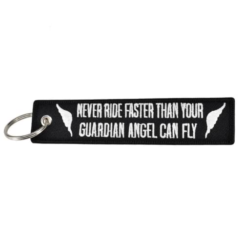 Portachiavi Moto, Portachiavi Auto, Accessori Moto, Accessori per Moto, Portachiavi Originale in Tessuto Never Ride Faster Than Your Guardian Angel Can Fly, Nero