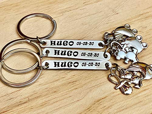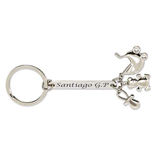 Portachiavi personalizzato con ciondoli da neonato, per bambini e bambine, in metallo e con l'incisione invisibile, ideale per nascita, battesimo o compleanno, incisione e personalizzabile, ad esempio: nome, data o iniziali del cognome. Ma è possibile inserire il testo che desiderate, a meno testo la dimensione è più grande. Per qualsiasi dubbio su Whatsapp +34 629 388 195