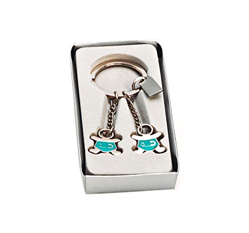 PORTACHIAVI DOPPIO BATTESIMO BIMBI BIMBI PANNELLO BLU INCISIONE IN PLACCHETTA SET 10 PEZZI BOMBONIERA BATTESIMO GEMMA