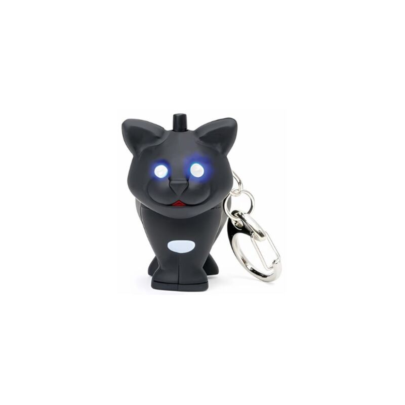 Portachiavi Gatto Nero Con Occhi Led Portachiavi a forma di gatto con occhi lampeggianti a LED blu brillante e un miagolio quando viene premuto il pulsante sulla testa Caratteristiche: luci LED blu miagolio realistico