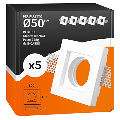 5x Portafaretti in Gesso da Incasso Controsoffitti - Quadrato 100x30mm - per Faretti diam. 50mm GU10 GU5.3 colore bianco - portalampada GU10 inclusi