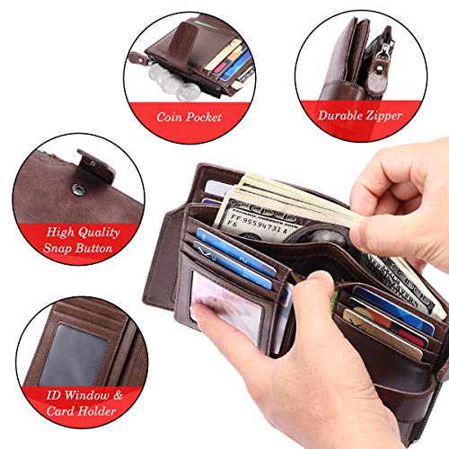 Portafoglio Uomo Pelle Vera RFID Blocco Biflod Portafogli Uomo Piccolo con Portamonete 12 Slot per Schede e 7 Scomparti per Contanti Carta di Credito Portafoglio Uomo Sottile con Cerniera (Caffè)