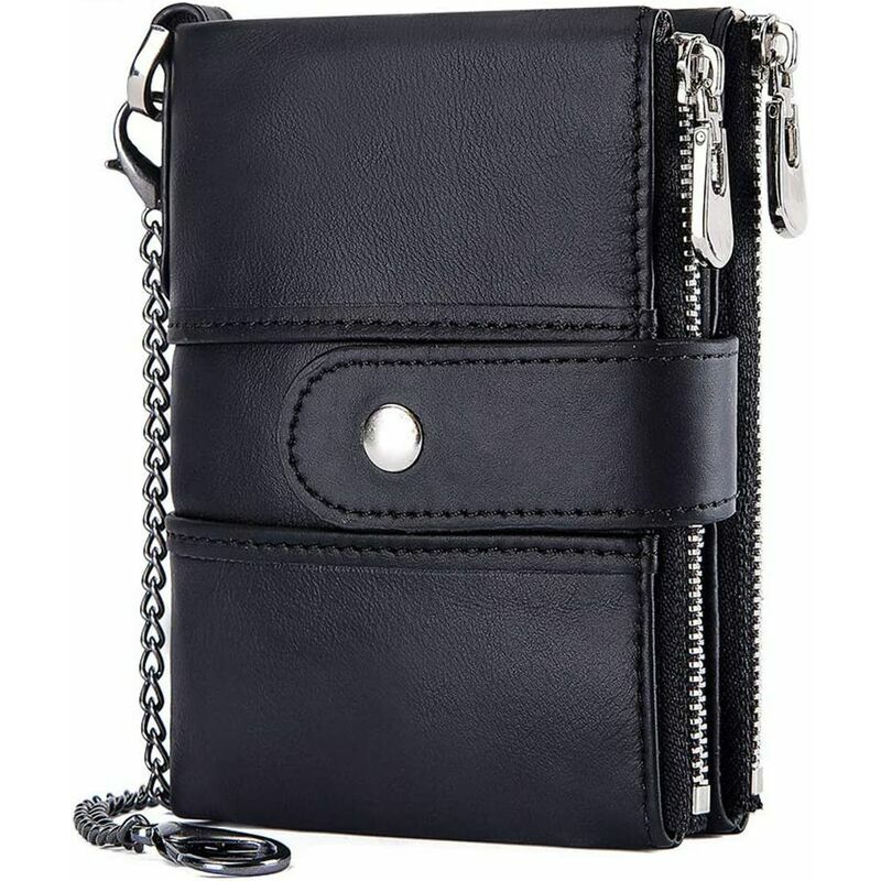 Pratico e molto capiente: 2 scomparti per banconote (500 banconote entrano facilmente), 16 scomparti per carte di credito di cui 2 con scomparti trasparenti, 2 scomparti per monete con cerniera. Il piccolo cambiamento ha abbastanza spazio nella tasca portamonete con un robusto pulsante. Il portafoglio può essere aperto e chiuso in modo affidabile e sicuro grazie alla grande cerniera. . Protettore e sicuro: il portafoglio in pelle da uomo ha una fodera interna anti-RFID e protegge in modo affidabile le tue carte dall'intercettazione dei lettori NFC. Proteggi la sicurezza della tua carta di credito. Portamonete doppia zip con catena, il portamonete può essere fissato saldamente con la robusta catena di metallo. . Dimensioni della borsa in pelle: circa 9x12x3 cm (LxAxP). Catena: lunga circa 26 cm. Si adatta a tutte le tasche dei pantaloni (sia davanti che dietro). Anche con molte carte e banconote, il portamonete con fessure per carte non diventa troppo grande. Lo noti non solo nella