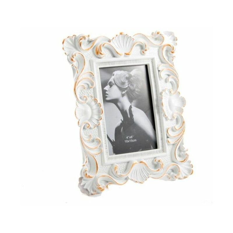 Portafoto in resina ornato da linee curve e motivi che ricordano una conchiglia. Per la fotografia 10x15. Misure totali: Larghezza: 21 cm | Altezza: 25,5 cm | Profondità: 2,5 cm