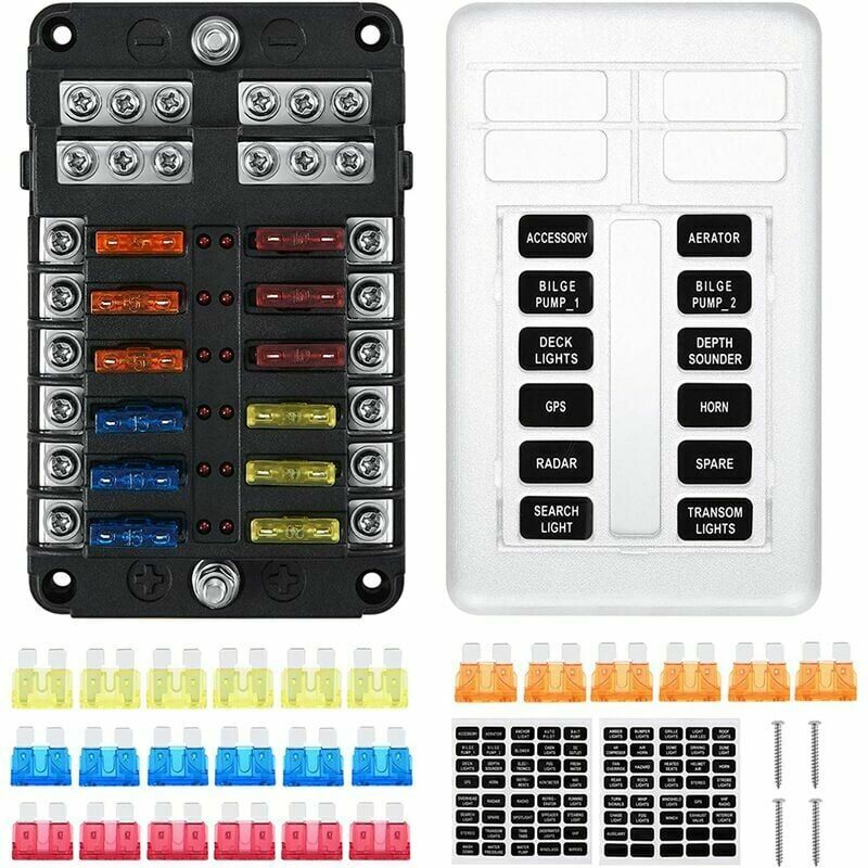 Spia a 12 LED - Scatola fusibili 12V con spia, i fusibili stessi si bruciano quando la corrente è troppo alta e la luce rossa si accenderà immediatamente, in modo da poter determinare facilmente il cortocircuito o qualsiasi altro errore e correggi l'errore senza sforzo. 【Materiale e sicurezza di alta qualità】 Realizzata in PBT, IP86 e certificata CE, questa lama della scatola dei fusibili è meccanicamente robusta, isolante, resistente al calore, che garantisce la tua sicurezza usa e ti aiuta a sbarazzarti di problemi come rotture, deformazioni, bruciature o cortocircuiti. perfetto per auto, auto, moto, barche, camion, camper, furgoni, SUV, trike, ecc. fornisce l'accesso ai fusibili e soddisfa i requisiti ABYC/USCG. 【Conduttività ottimale e miglior servizio】 Questa scatola dei fusibili ATC/ATO/ATF a 12 vie con le etichette adesive fornite consente di distinguere facilmente quali cavi corrispondono ai fusibili . Scegli il portafusibili a goccia, che soddisfa tutti gli standard di una