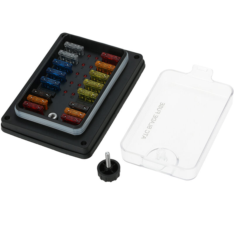 Questa scatola fusibili è adatta a tutti i tipi di applicazioni automobilistiche e marine, compresi i sistemi a 6, 12 e 24 V (tensione massima 32 v). Caratteristiche: Scatola dei fusibili a 10 vie. Fusibili 5A 7,5A 10A 15A 20A 25A. Con l'indicatore di avvertimento LED rosso, se un fusibile spegne il LED rosso accanto al fusibile guasto, si illumina consentendo un'identificazione rapida e senza problemi di un guasto. Grado di protezione IP56, copertura per pc trasparente e chiusura a vite per proteggere circuiti e fusibili da polvere, sabbia, schizzi e detriti. Passacavo e lente trasparente sono inclusi per la massima protezione. Il design del terminale con gancio posteriore consente di montarlo in qualsiasi foro da pannello da 2,4 "x3,7", utile per nascondere tutti i fili. Ampiamente usato per auto, barca, marine, caravan, yacht e così via. Specifiche tecniche: Materiale: PBT + PC + rame Fusibile di accettazione: Fusibile lama standard ATC Dimensione filo terminale: # 10-16 AWG