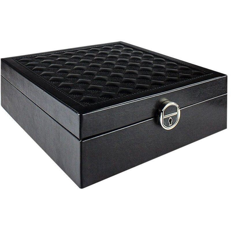 Conserva tutti i tuoi gioielli in questo elegante portagioielli! L'esterno della scatola è rivestito in similpelle nera con dettagli trapuntati e all'interno del coperchio è presente un grande specchio. Lo specchio può anche piegarsi e inclinarsi verso il bordo anteriore della scatola. Ci sono molte opzioni di archiviazione e puoi riempire la scatola con qualsiasi cosa, dagli anelli ai braccialetti. Nella scatola ci sono 2 cuscini per orologi e 1 scatola da viaggio che puoi estrarre e portare con te in viaggio. Inoltre viene fornito con una chiave, così puoi facilmente chiudere a chiave la scatola e conservare i tuoi gioielli in un luogo sicuro. - Elegante portagioie in similpelle nera - Ci sono sia cuscini per orologi che una scatola da viaggio - Chiudete il portagioielli con la chiave in dotazione Specifiche: Colore nero Materiale: finta pelle Dimensioni: ca. 25 x 25 x 8,5 cm Numero di scomparti, portagioie: 14 Numero di scomparti, scatola da viaggio: 7 La confezione contiene: 1x