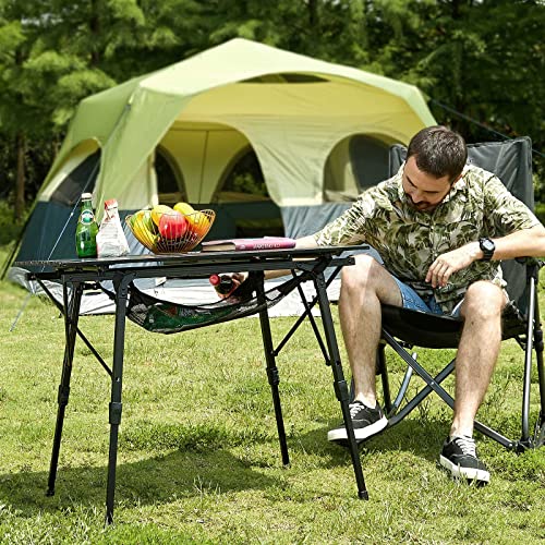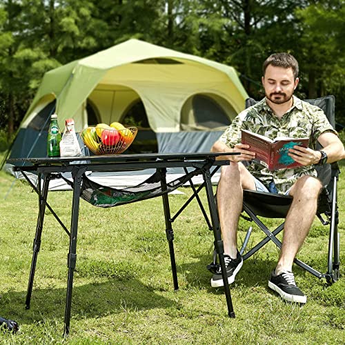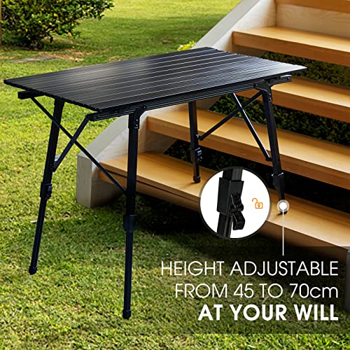 4 gambe regolabili: Il tavolo da campeggio pieghevole portatile presenta 4 gambe telescopiche regolabili. Ogni gamba può essere regolata separatamente dall'altezza da 45 cm a 69,9 cm per adattarsi a superfici irregolari e soddisfare tutte le esigenze per l'avventura in campeggio.