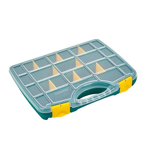coperchio trasparente, base verde e divisori e chiusure gialli