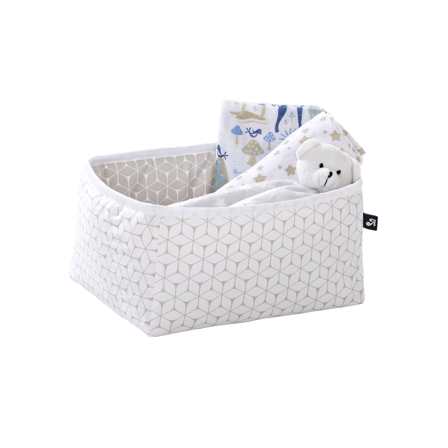 Pratica scatola portaoggetti come accessorio per il fasciatoio o per la cameretta. Utile per riporre panni, prodotti per la cura, giocattoli o altri piccoli oggetti. Dettagli del prodotto e istruzioni per la cura: Dimensioni (lunghezza x larghezza x altezza): 25 x 21 x 12 cm Materiale: 100% cotone Imbottitura: 100% poliestere Lavabile fino a 30 °C Adatto all'asciugatrice, temperature ridotte Forma quadrata Oeko-Tex Standard 100