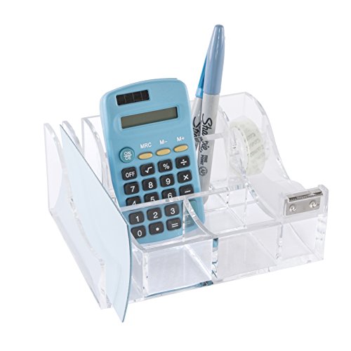 Stylishly designed desktop organiser from OSCO with tape dispenser made from crystal clear, chunky acrylic. Various compartments for tidying away all those bits and pieces otherwise known as clutter !