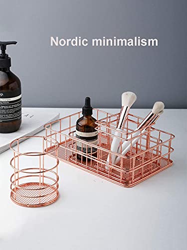 Portapenne, portamatite, portabicchieri o pennelli da trucco, in metallo color oro rosa, da scrivania, organizer per scrivania, in fil di ferro, per l'ufficio, la casa e la scuola rotondo