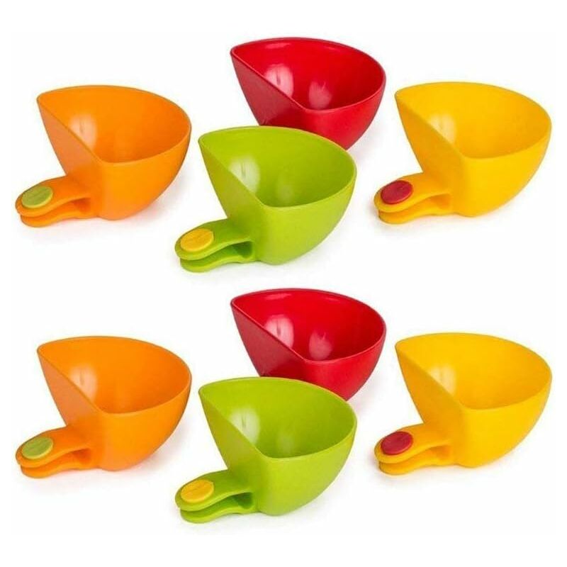 COMODO E PRATICO -- Graziosi contenitori per salsa Scoop contengono 1/3 di tazza - Plastica lavabile in lavastoviglie e adatta agli alimenti - Non graffiano i piatti! È una comoda alternativa per contenere liquidi o piccoli oggetti artigianali, non solo per il cibo. DIMENSIONI COMPATTE E DESIGN COLORATO --3,2 x 3 x 3,2 pollici Facile da trasportare con il piatto, facile da riporre nel cassetto della cucina, carino con 4 colori rendono la cena più piacevole per i bambini. MUST HAVE PER TE CUCINA -- Funziona sulla maggior parte dei piatti, compresi i piatti di carta, il set di gadget da cucina viene fornito con 4 colorati e divertenti da usare ciotole - Ideali per campeggio all'aperto, feste, potluck, cene, picnic o in spiaggia, in soggiorno FACILE DA USARE E CONSERVARE - Piccole ciotole per contenitori per servire salse condimenti alla tua prossima festa o evento, ultra -comodo. Fermagli in plastica che afferrano comodamente il bordo del piatto da portata, vassoio o piatto per