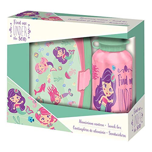 Kids - Set di portapranzo in plastica e borraccia in alluminio di Siren, borsa di tela e da spiaggia, 40 cm, multicolore