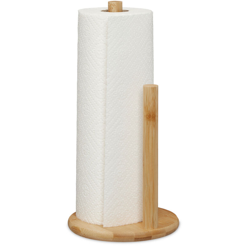I guai in cucina capitano spesso: si rovescia un bicchiere, il sugo schizza sui fornelli e la panna straborda dalla ciotola. Grazie al cielo sai dove si trova la carta assorbente! Grazie al suo design pratico, con un'ampia base rotonda e la barra laterale ferma-carta, questo portarotolo ti permette di strappare comodamente un foglio con una sola mano e pulire subito la sporcizia. Il materiale usato è ideale per ambienti umidi come la cucina e porta un tocco naturale all'ambiente. Supporto per rotoli da cucina in dettaglio - Misure H x D: 28 x 14,5 cm ca. - Peso: 220 g ca. - Materiale: bambù - Colore: marrone chiaro naturale Portarotolo per carta assorbente - Supporto per rotoloni di carta da cucina compatibile con lo scottex - L'asta verticale a lato impedisce che la carta inizi a srotolarsi da sola - Per conservare la carta assorbente in un posto preciso e averla a portata di mano - Il portacarta è verticale, pensato per essere appoggiato sul piano di lavoro della cucina - Design