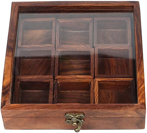 Zuvo Portaspezie in legno con coperchio, 9 piccoli scomparti Masala Dabba e vetro scorrevole