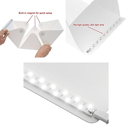 Striscia luminosa LED integrata, 2 tele di fondo (bianco, nero) e cavo micro USB inclusi (banca di alimentazione non inclusa), ganci fissi con resistenza al slittamento. Riflettente, per scattare foto di alta qualità.