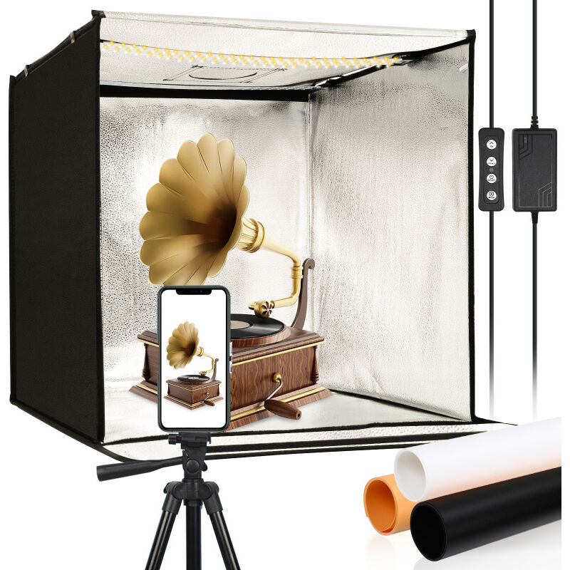 Caratteristiche del prodotto Studio fotografico mobile e pieghevole con illuminazione LED integrata ad alte prestazioni per servizi fotografici con fotocamera portatile o smartphone. Due strisce luminose a LED posizionate per un contrasto ottimale, luce simile alla luce diurna da 3000 a 7000K con elevato indice di resa cromatica per colori uniformi Misure 60,0 x 60,0 x 60,0 cm, che lo rendono adatto a un'ampia gamma di prodotti;