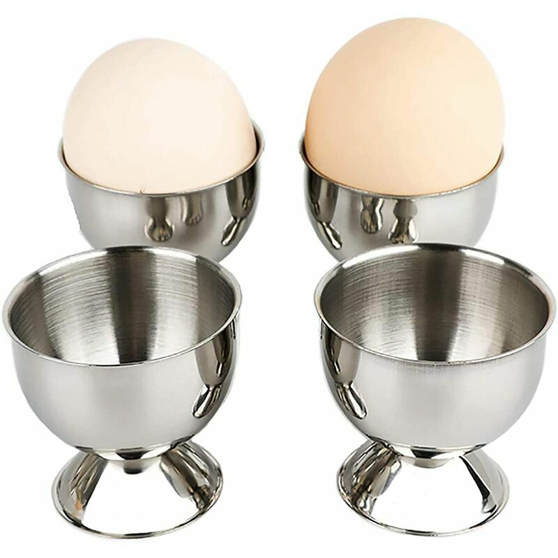 Dimensioni: 4,8 x 4,5 x 3,5 cm - Colore: metallo argentato - Set di 4 portauova. Materiale: il portauovo è realizzato in acciaio inossidabile, sicuro e non tossico, adatto alla lavastoviglie sicuro. Se accidentalmente rovesciato, non è fragile come la ceramica. Comodo per uova morbide, medie o durante la cottura. Adatto a dimensioni universali, ideale come regalo o per completare la decorazione della tua tavola.