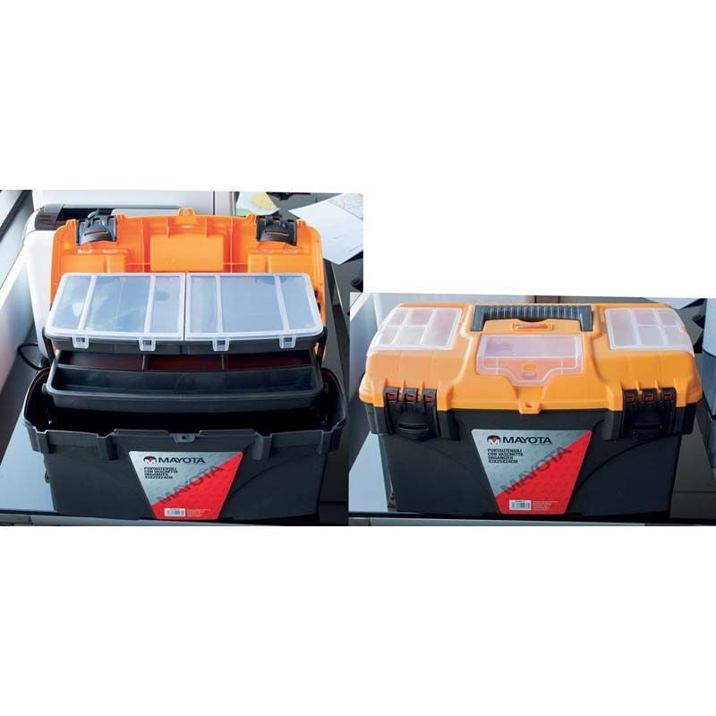 Valigetta portautensili, man170, in resina, con vassoio e organizer interno e sul coperchio, cerniere in plastica, cm 43,4x25,7xh.24, colore nero/arancio