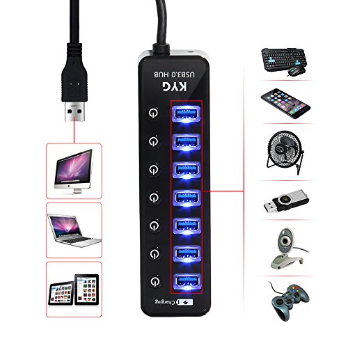 KYG USB Hub 7+1 Porte Interruttori Indipendenti con Alimentatore 5V LED Blu USB 3.0 Sdoppiatore per PC Laptop Computer Nero